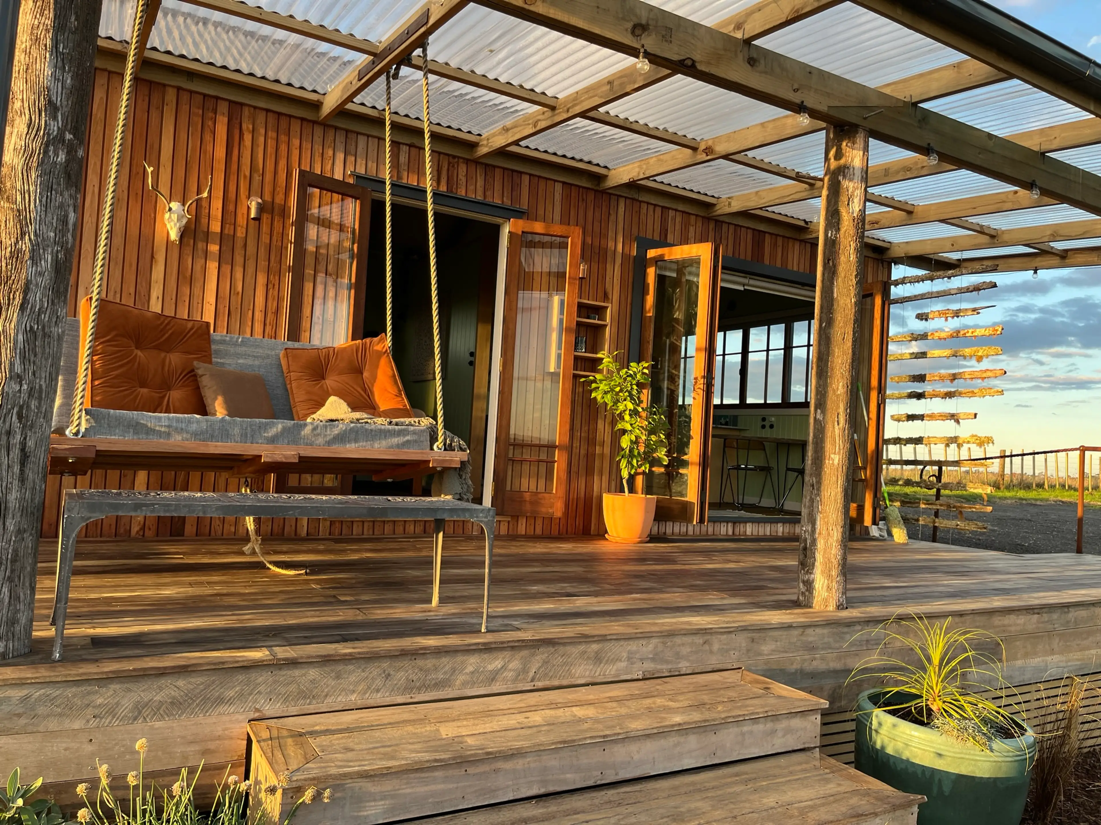 Discover Skyview Cottage, conveniently situated just a half-hour drive from downtown Auckland. Tucked away amidst the undulating countryside, this retreat offers a secluded haven and a panoramic vista of the picturesque surroundings. Immerse yourself in its charming ambiance, blending modern comforts with rustic allure. Indulge in a restful slumber on a plush queen-size bed, complete with a contemporary ensuite accessed through a sliding barn door. Adjacent to this cozy sanctuary, a well-appointed lounge and kitchenette await your convenience. Step outside onto the deck, where a delightful swinging chair beckons for moments of relaxation amidst nature's serenity. Treat yourself to a luxurious soak in the outdoor stone bath beneath a canopy of twinkling stars, or gather around the crackling campfire for an evening of marshmallow roasting and storytelling. And by booking directly with us, enjoy exclusive benefits and a seamless experience from reservation to check-out.